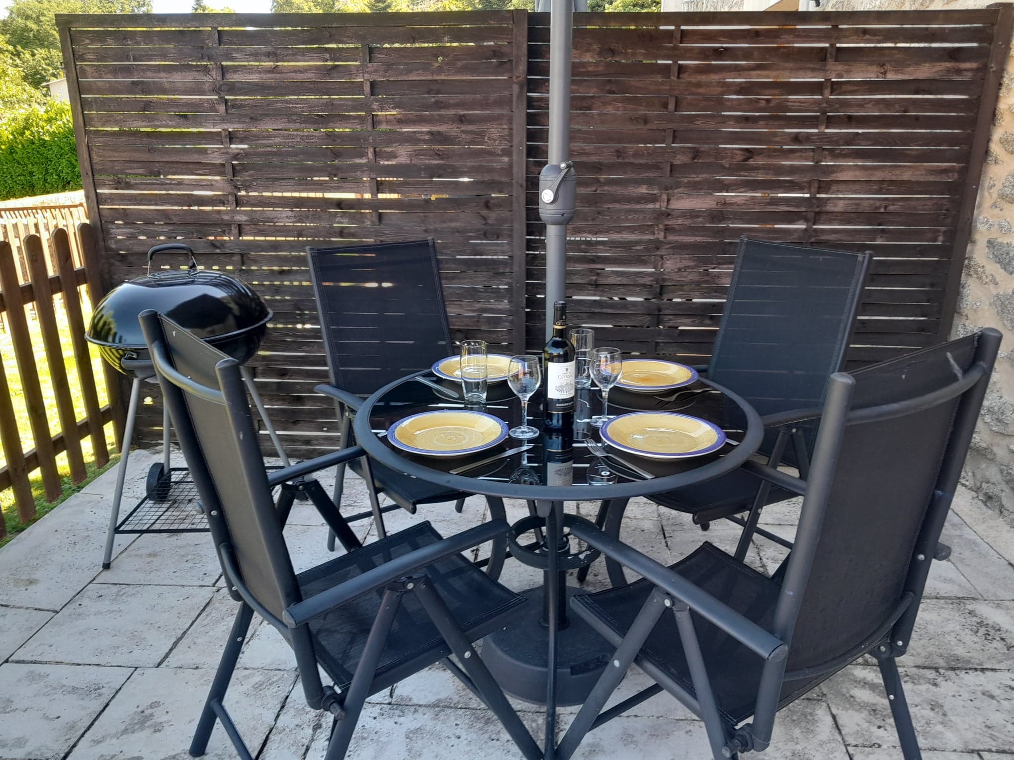 Outside: Shared outdoor 12m x 6m pool (in season), Private patio with BBQ, outdoor dining, shared enclosed terrace garden with washing line. Towels for the pool are included.